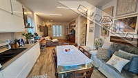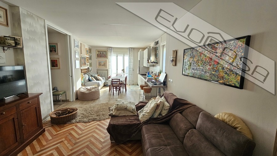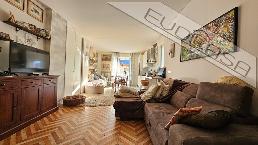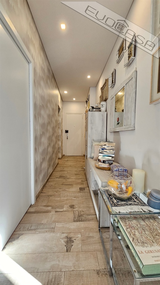 L’appartamento è stato completamente ristrutturato nel 2017, con particolare attenzione alla scelta dei materiali e delle finiture. La zona giorno si presenta come un ambiente living accogliente e moderno, impreziosito da una pavimentazione originale che combina armoniosamente parquet e gres porcellanato in tonalità calde, creando un piacevole gioco di contrasti.